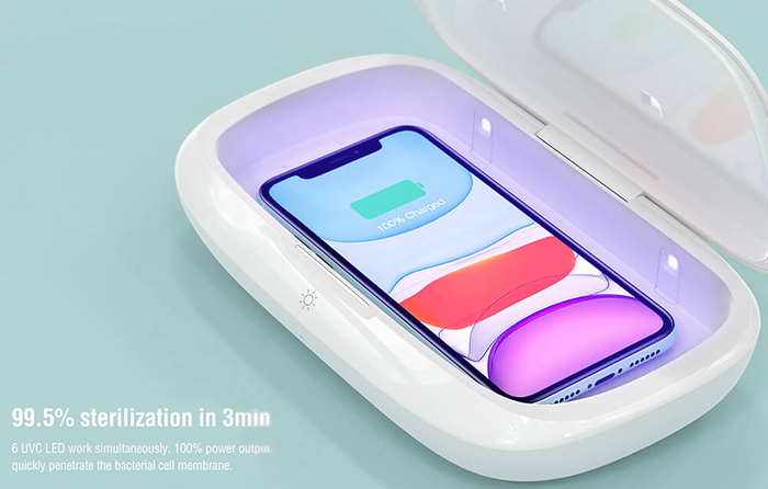 Cutia nu doar sterilizeaza telefonul mobil, dar incarca si telefonul in acelasi timp.